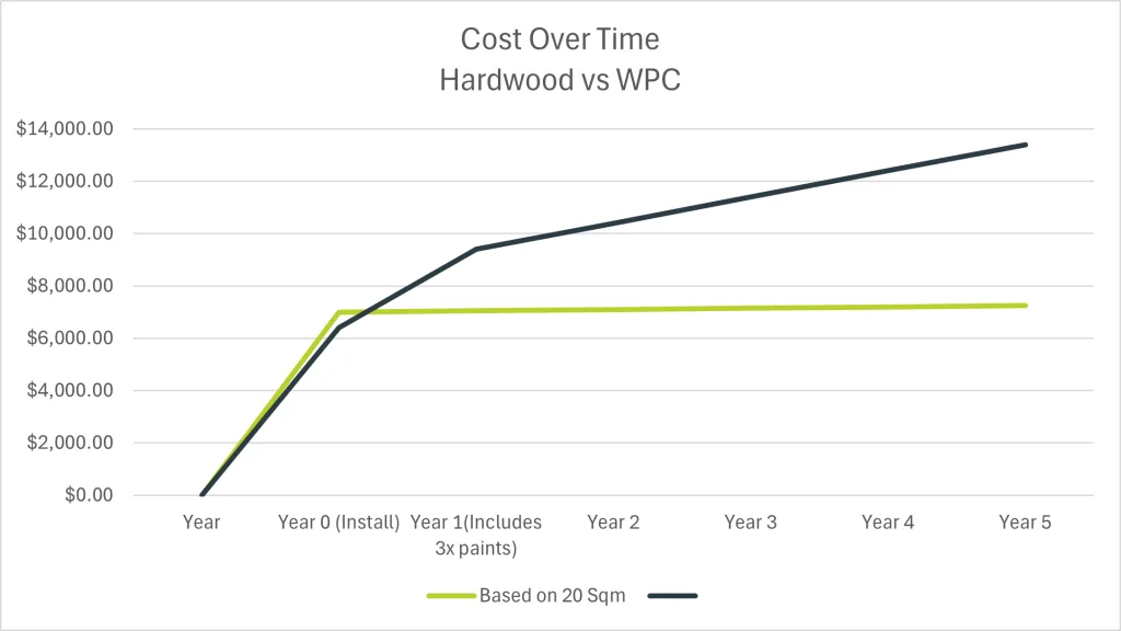 We took a Merbau Hardwood 90mm timber product and compared the total cost over 5 years to COEN Composite 140mm boards on a 20 Sqm deck*.